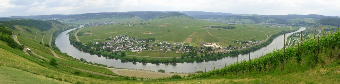 Der Weg wendet sich nun dem Moseltal ab und auf eine Hochebene im Hinterland, die zu Beginn ebenfalls mit Reben bewachsen ist. Hier lässt es sich vortrefflich durch die Weinstöcke spazieren! Der Weg führt entlang eines ehemaligen, heute ausgetrockneten Seitenarms der Mosel. Eine Infotafel informiert über die Entstehung.